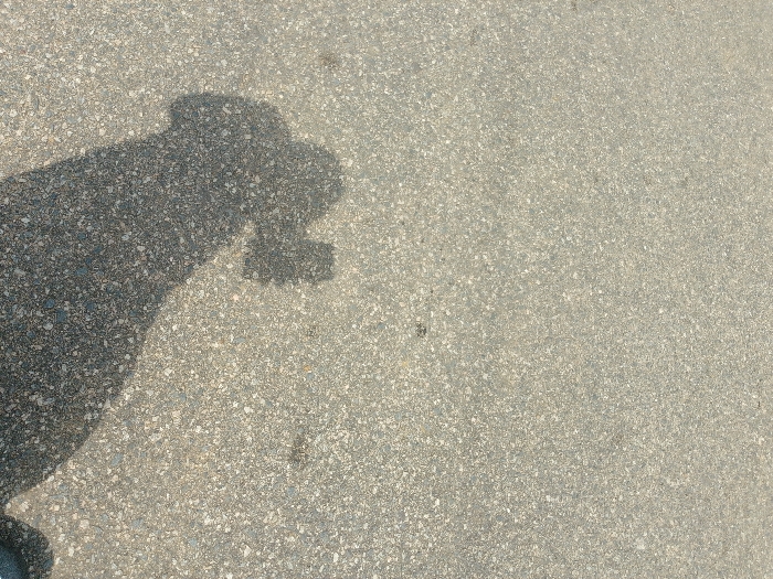 The scene is an outdoor ground-level view of a light grey, granular asphalt surface within the city of Unknown, Unknown. A dark grey, well-defined shadow, consistent with a human figure holding a camera or similar device, is cast across the lower-left portion of the frame. The shadow distinctly outlines a head and upper torso, with a device visible in the hand area featuring a prominent lens-like protrusion. The sharp edges of the shadow suggest direct sunlight. No other individuals or objects are present.
