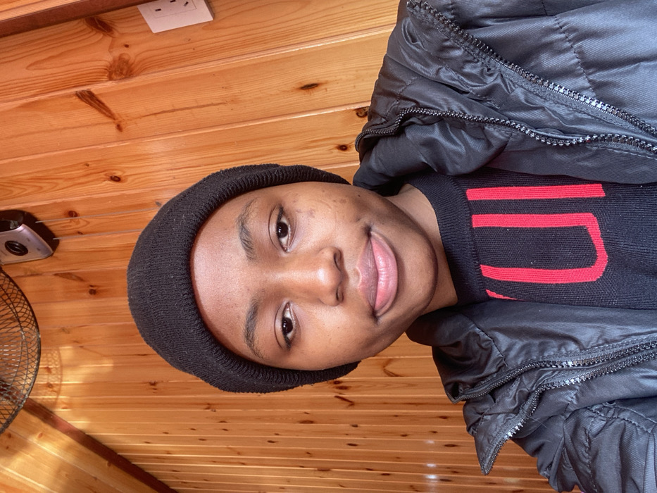 A person wearing a black beanie, a black sweater with a red design, and a black jacket poses for a selfie