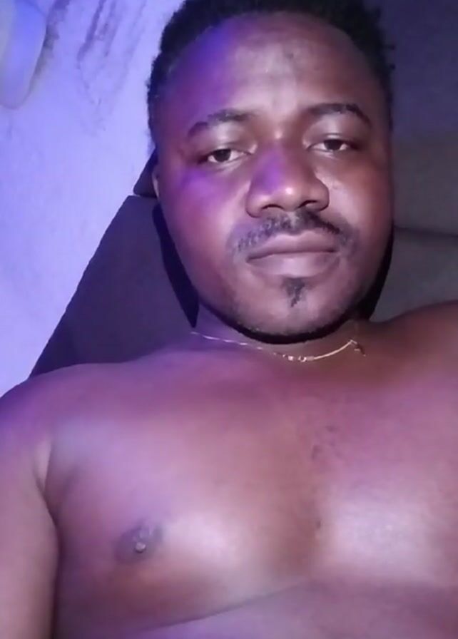 A man is reclining on what appears to be a dark-colored couch. He is shirtless and wearing a thin gold necklace. The man has dark skin, a mustache, and a small goatee. The room is lit with a blue and purple light, possibly from a lamp or decorative lighting. A white object is visible in the background, possibly a container or vase on a table. The camera angle suggests the video is being taken from a high vantage point, likely by the man himself.
