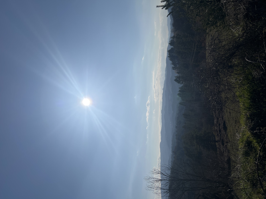 The image displays a sunlit mountainous landscape in Svetulka, Bulgaria. The upper half of the frame is dominated by a clear, bright blue sky containing a few scattered white clouds, primarily along the horizon line. The sun, a prominent bright circle with distinct radial lens flares, is positioned in the upper center-right. The lower half of the image features multiple layers of terrain. In the immediate foreground, dark, tangled undergrowth and patches of green grass are visible. Further back on the left, a bare deciduous tree stands without leaves. A dense forest, primarily composed of evergreen trees, covers rolling hills in the mid-ground. Within this forested area, horizontal utility lines are discernible. Multiple layers of mountains extend into the distant background, appearing progressively lighter and hazier due to atmospheric perspective. No individuals, animals, or explicit structures beyond the potential utility lines are present in the scene.
