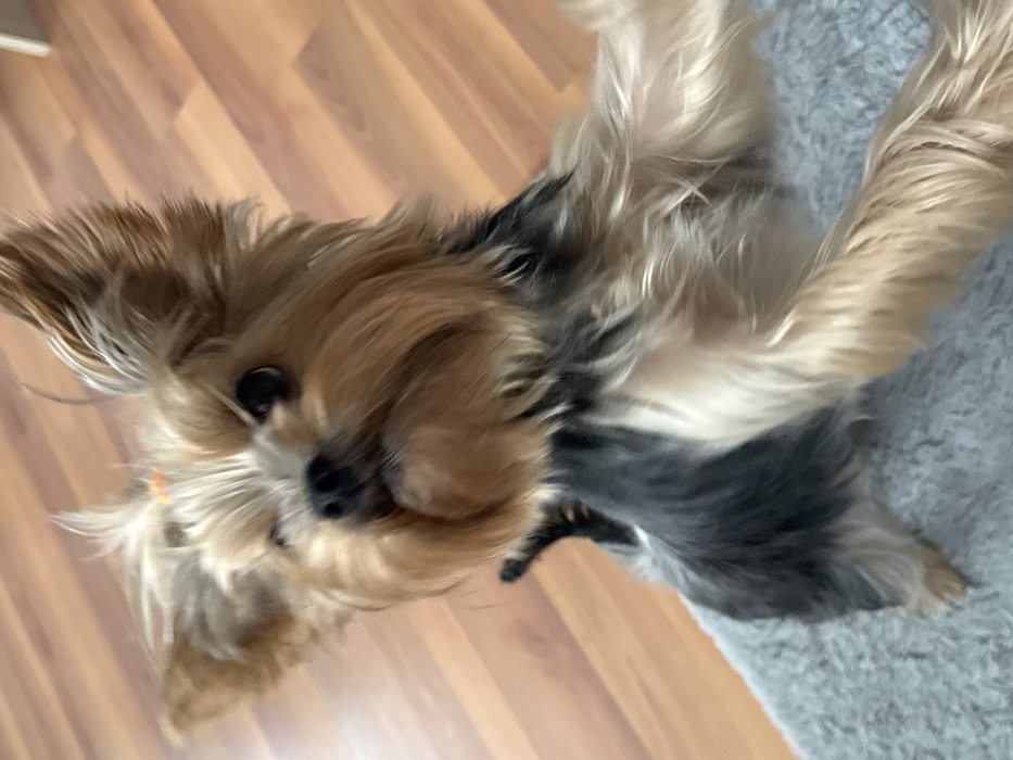 - "A Yorkshire Terrier is depicted standing upright on its hind legs on a light grey rug, with its front paws extended forward and raised" by FM-MKghF3, licensed under CC BY 4.0