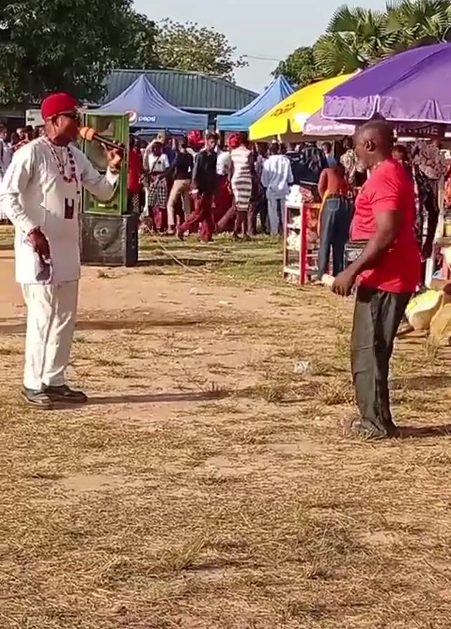 two men and a crowd in an outdoor setting with several tents. One man, wearing a white outfit and red hat, is speaking into a microphone while standing near a speaker. Another man, wearing a red shirt and black pants, is standing a few feet away. The crowd is behind them, and there are tents in the background with several people walking around. The ground is dry and grassy. The camera moves to focus on the back of a person’s head with dreadlocks.