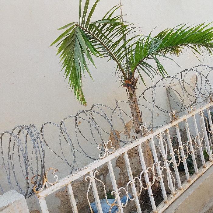 The image presents an outdoor scene in Dan Maliki, Nigeria, focusing on a security barrier. In the foreground, a white metal fence, exhibiting weathered paint and some rust, extends horizontally across the frame at an upward angle. The fence features vertical bars interspersed with decorative, scrolled metalwork on its upper sections. Mounted atop this fence are several continuous coils of silver-grey razor wire, forming a jagged barrier. Behind the fence and razor wire, a young palm tree with green fronds and a slender, textured brown trunk is visible. The background consists of a plain, light-colored (off-white or beige) wall, which shows some dark discolored areas on its lower portion. No individuals, actions, or specific interactions are depicted.