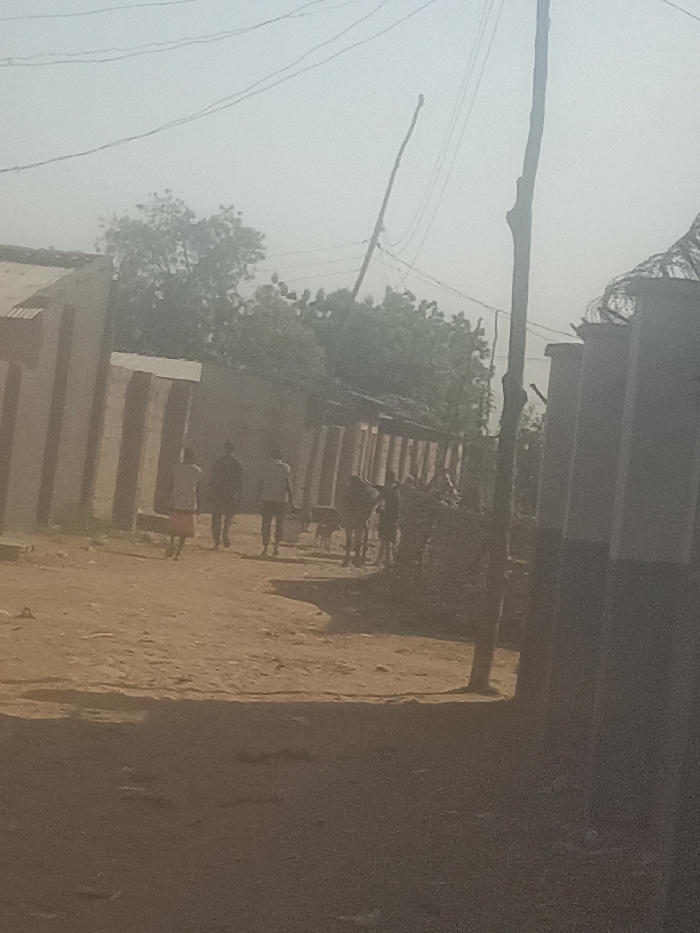A dusty street scene with several figures in the distance. Three people walk near a donkey loaded with wood or other materials. Houses with corrugated metal roofs and fences line the street. Power lines stretch across the sky. The air is hazy, possibly due to dust or smog. A utility pole stands prominently in the foreground, partially obstructing the view.