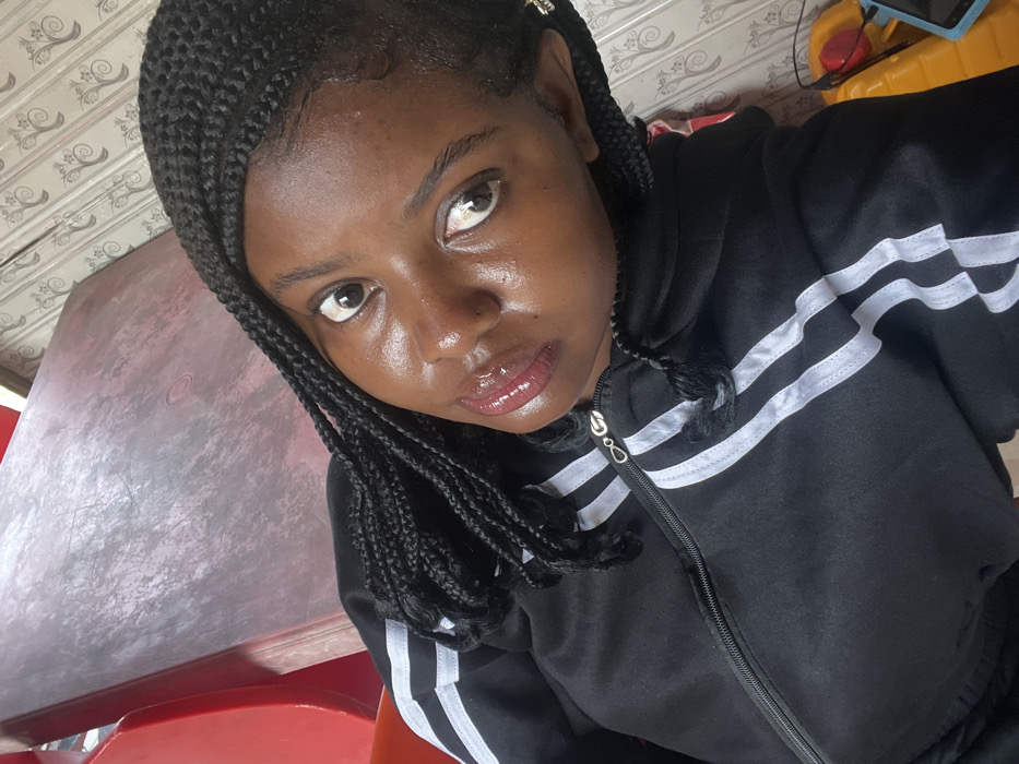 The scene depicts a young adult female indoors in Osu, Nigeria, captured in a diagonal self-portrait