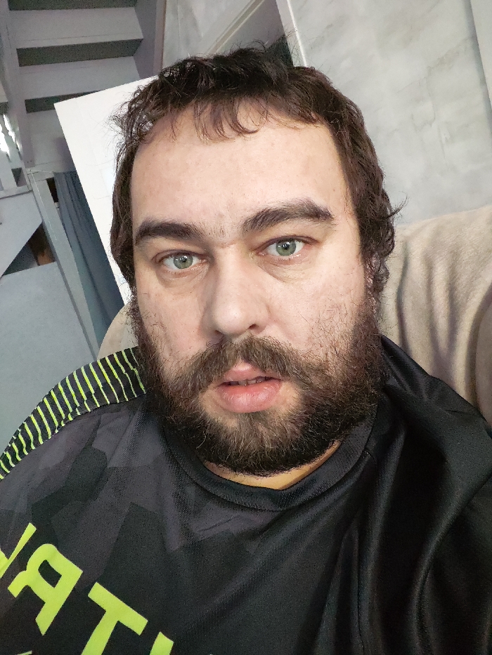 A close-up, frontal portrait of an adult male is depicted in an indoor setting in an unidentified location within the city of Unknown, Unknown. The male subject possesses dark brown, wavy hair, a full dark brown beard and mustache, and green eyes; his mouth is slightly ajar. He is dressed in a dark grey/black short-sleeved shirt featuring a neon yellow/green geometric pattern, including inverted yellow-green text on the left chest area and diagonal stripes on the right shoulder. A light brown or beige upholstered surface is visible behind his right side. The background to the left includes a light-colored vertical panel and a grey textured wall with angular architectural elements in the upper far left, suggesting stairs or structural components. No other individuals are present, and no specific action or interaction is observable beyond the subject posing for the photograph.