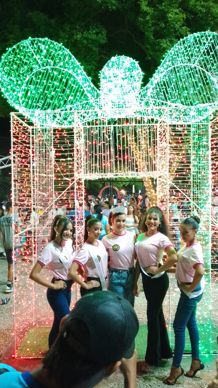 Five young women stand in front of a large, lit-up gift box decoration. They are wearing matching pink shirts with dark jeans or pants, and some have sashes. One woman wears a tiara. The lit box is decorated with white, red, and green lights. Many people are gathered behind the gift box. A man wearing a blue shirt and black cap is crouched down in the foreground.