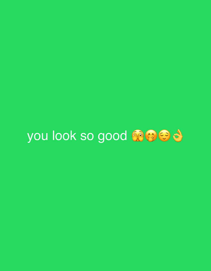 A simple, bright green background features the text "you look so good" in white. Four emojis follow the text: a face with hands covering its eyes, a face with hands making a heart, a face with a peaceful closed-eye smile, and a hand giving the "okay" gesture. The text and emojis are centered horizontally.