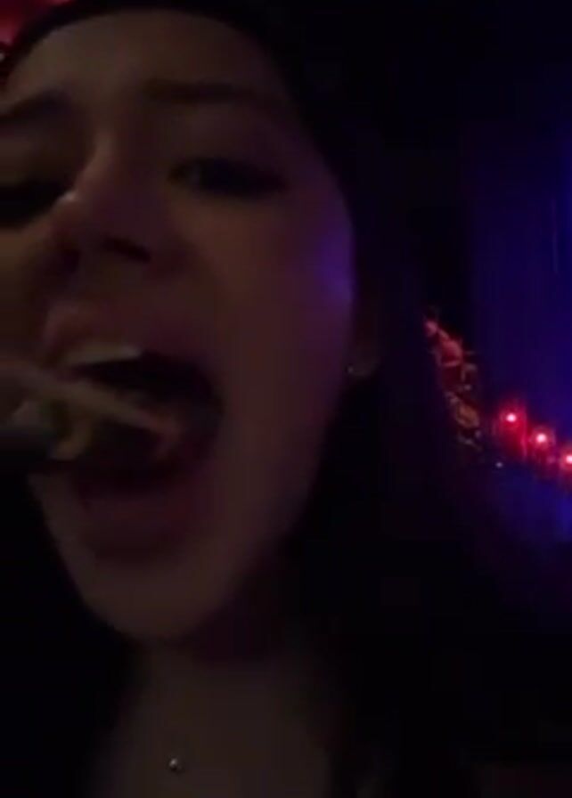 A young Asian woman is eating sushi. She is indoors in a dark, lounge-like setting with red and blue lights. She eats the sushi with chopsticks from a tray with five pieces of sushi, wasabi, and ginger. Other patrons can be seen in the background.
