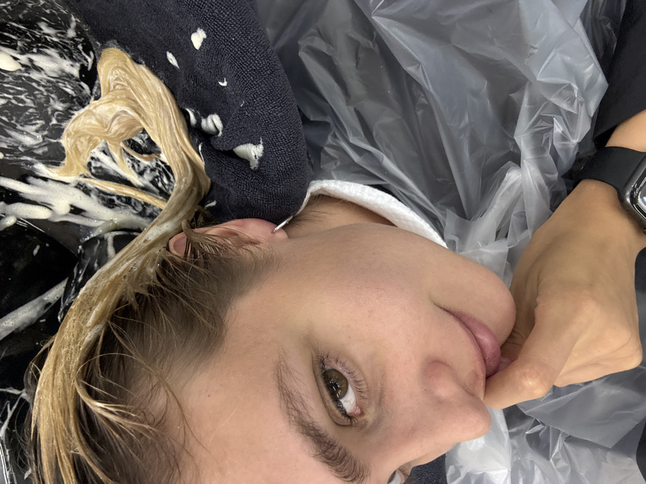 A female individual is depicted receiving a hair treatment in a salon environment. Her wet, light blonde hair, coated in a white foamy substance (likely shampoo or a treatment product), rests in a black wash basin. A dark grey or black terry cloth towel is draped around her neck within the basin, also showing traces of the white substance. She is wearing a clear, crinkled plastic protective cape over her torso and shoulders. The woman, shown from an overhead, slightly tilted perspective, has light skin, brown eyes, and light brown eyebrows. She displays a subtle smile and wears a small silver hoop earring in her left ear. Her left hand is positioned near her mouth/chin, and a black smartwatch with a dark screen is visible on her left wrist. The specific location within the city of Tbilisi, Georgia, cannot be determined from the visual evidence.