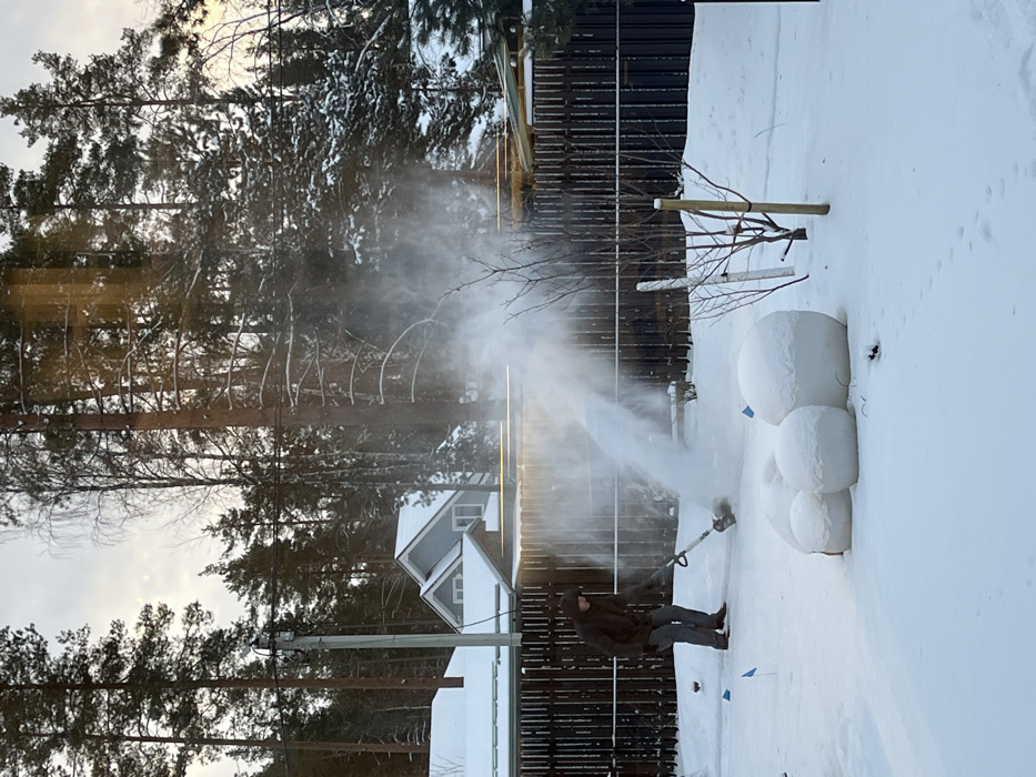 The scene depicts a snow-covered residential area in Finskiy Briz, Russia, under overcast winter daylight. In the foreground, a lone individual, dressed in a dark hooded jacket, blue jeans, and brown shoes, operates a dark-colored snow blower. The snow blower is actively propelling a dense stream of white snow upwards and towards the right. The ground is uniformly covered in a thick layer of white snow. In the lower foreground, three large, rounded objects, possibly garden decorations or plant covers, are heavily blanketed with snow. Several small blue markers are visible in the snow near the individual and the rounded objects. Behind the individual, a dark brown wooden privacy fence stretches horizontally across the midground. Beyond the fence, several houses are visible, including one with light blue-grey siding and a snow-covered roof. A utility pole with power lines is present on the left side, behind the fence. The background is dominated by numerous tall coniferous trees, primarily pines, and some bare deciduous trees, all with snow visible on their branches. The sky above is bright but overcast. Faint footprints are visible in the snow in the lower right foreground.