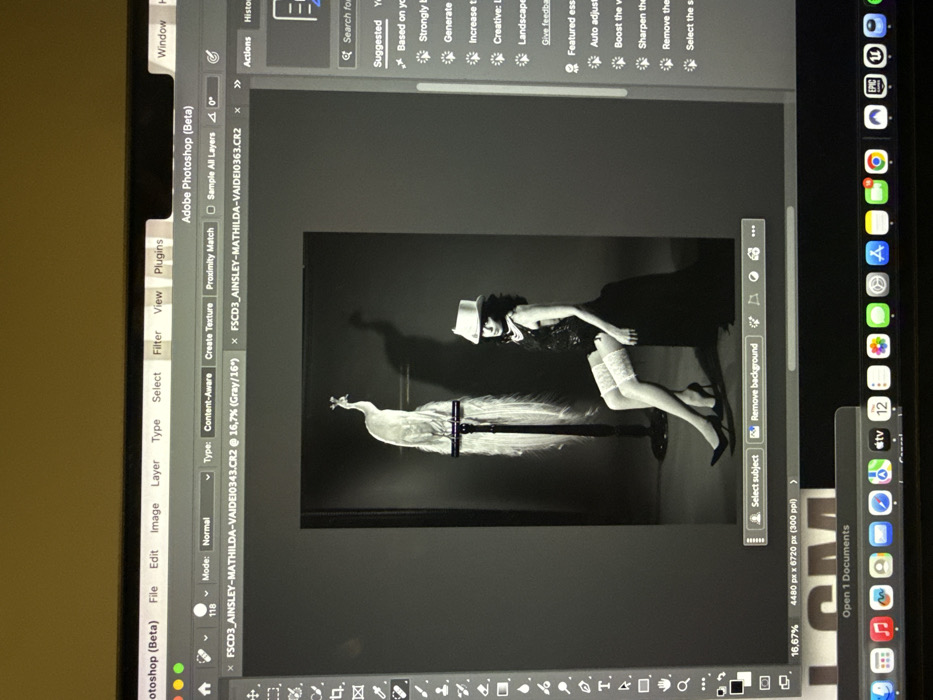computer screen displaying Adobe Photoshop (Beta). Two files, "FSCD3_AINSLEY-MATHILDA-VAIDEI0343.CR2" and "FSCD3_AINSLEY-MATHILDA-VAIDEI0363.CR2", are open. The active file features a black and white image of a woman in a hat and hosiery posing next to a peacock on a stand. Photoshop's interface elements are visible, including the menu bar, tools, and side panels with features like "Suggested Actions." The image is at 16.67% zoom, with dimensions of 4480px x 6720px at 300 ppi.