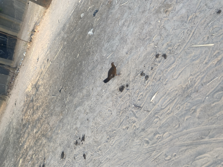 A bird stands on a ground. The ground appears sandy or dusty, marked with various tracks. Bird droppings are scattered around it. The scene is a low-angle shot, with the horizon and bird at the bottom and a building to the left. The ground is light-colored with darker spots and lines forming abstract patterns.