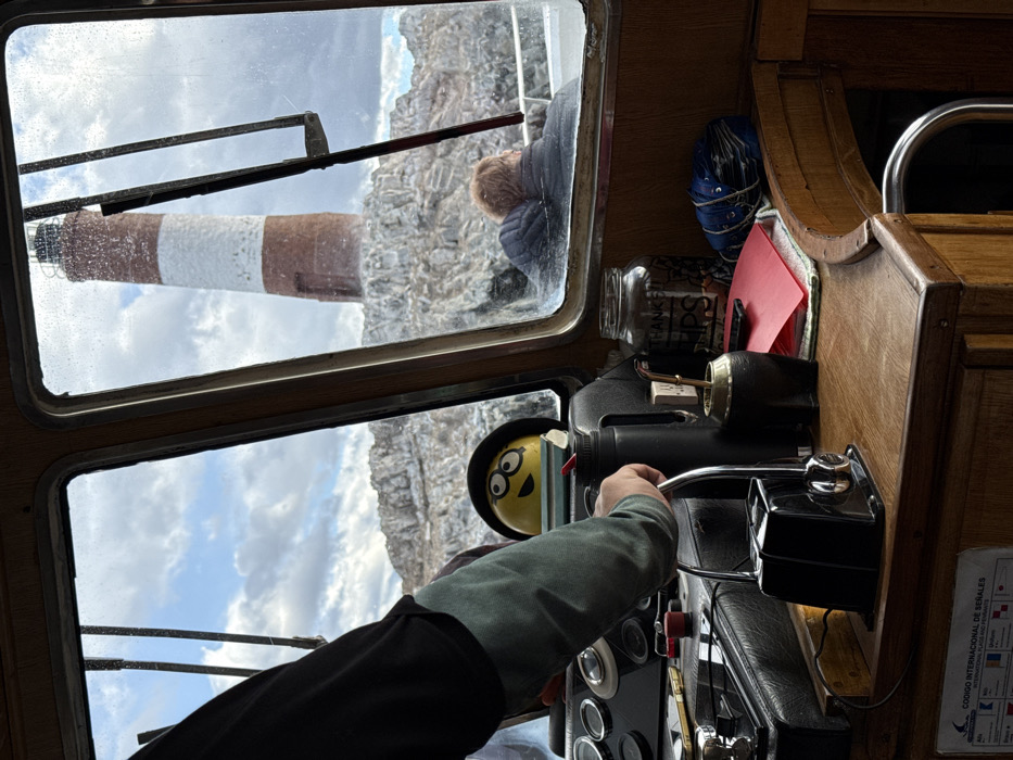 The image provides an interior view from a boat's cabin, looking forward through multi-paned windows at the Les Éclaireurs Lighthouse near Ushuaia, Tierra del Fuego, Argentina