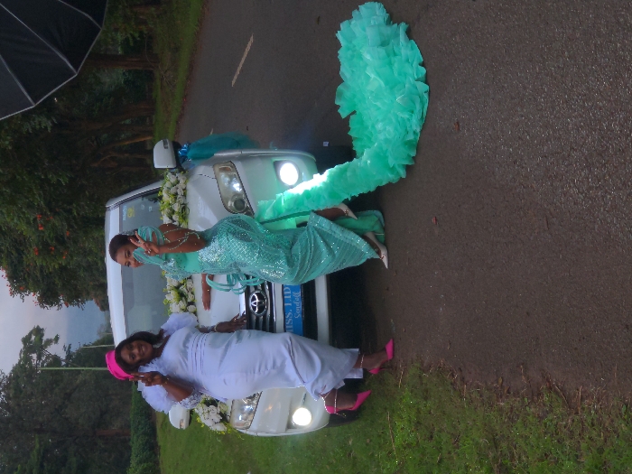 Two women are posing for a photograph in front of a white SUV. The woman on the left is wearing a white dress with a ruffled neckline and a pink hat. She is holding her hand up in a peace sign. The woman on the right is wearing a turquoise dress with a ruffled neckline and a train. She is also holding her hand up in a peace sign. The car is decorated with flowers and blue ribbons. The women are standing on a paved road. Trees and greenery are visible in the background. The photograph is being taken in New Hope, Tanzania, with the coordinates -3.275 latitude and 37.317 longitude. A black umbrella is visible to the right of the frame. The car has "MISS. I.D Sendoff" displayed on the front. A large piece of green fabric (possibly a train) is draped behind the woman in the turquoise dress.