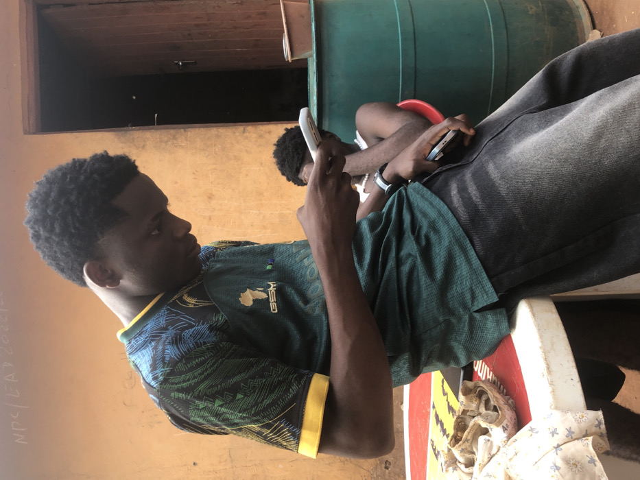 The image depicts an outdoor scene in Eziudo, Nigeria, featuring two young Black males. In the foreground, a male with short, dark, curly hair is leaning on a white table or counter with red stripes. He is looking down intently at a white smartphone held in both hands. He wears a dark teal polo shirt with yellow trim and a distinct black, green, and yellow pattern on the shoulders and upper sleeves, featuring an "Africa GSM" logo on the left chest. He wears faded dark grey jeans, with a dark-colored smartphone visible in his right hand or front pocket. Partially visible behind him, a second male sits on a red chair, holding a white smartphone near his face. He has short, dark, curly hair and wears a white tank top, a white beaded necklace, and a light blue wristband on his left arm. The background consists of an orange-brown wall with a faint inscription "NPC/EAD2022" in the upper left. A closed dark wooden door is visible on the right side of the wall. To the right, a large green plastic barrel and a small brown container are present on the ground.