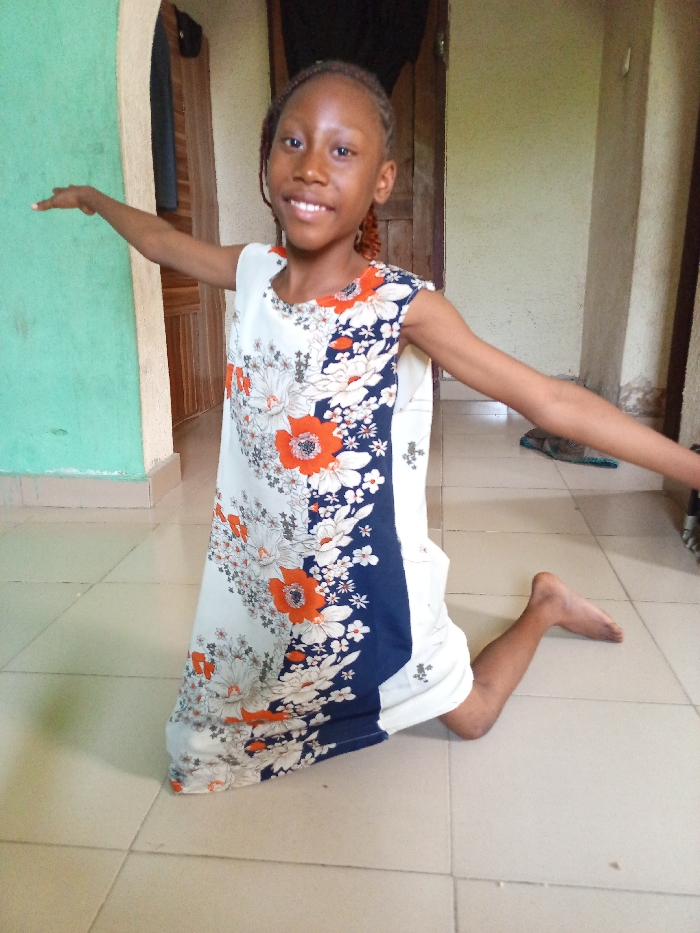 A young girl with a dark complexion and braided hair with reddish-brown highlights is depicted kneeling on a beige tiled floor in an indoor location within Zango-ndaji, Nigeria. She faces the camera, smiling and showing her upper teeth, with her arms outstretched horizontally. She wears a sleeveless white dress patterned with large orange and white flowers, featuring a vertical navy blue panel with white floral designs on the right side. The background includes a light teal-painted wall to the left, a partially visible wooden door behind her, and a light-colored wall to the right. A dark object hangs within a rounded doorway on the left, and a single slipper is visible on the floor in a doorway further right.