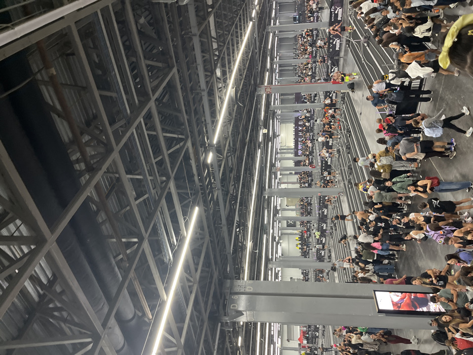 A large indoor space is filled with rows of people standing. A running track is visible between the rows of people, with runners participating. The ceiling of the building has exposed metal beams. Long rows of light fixtures span the length of the room. A screen displays images near the bottom of the view. Some signage is seen along the track.