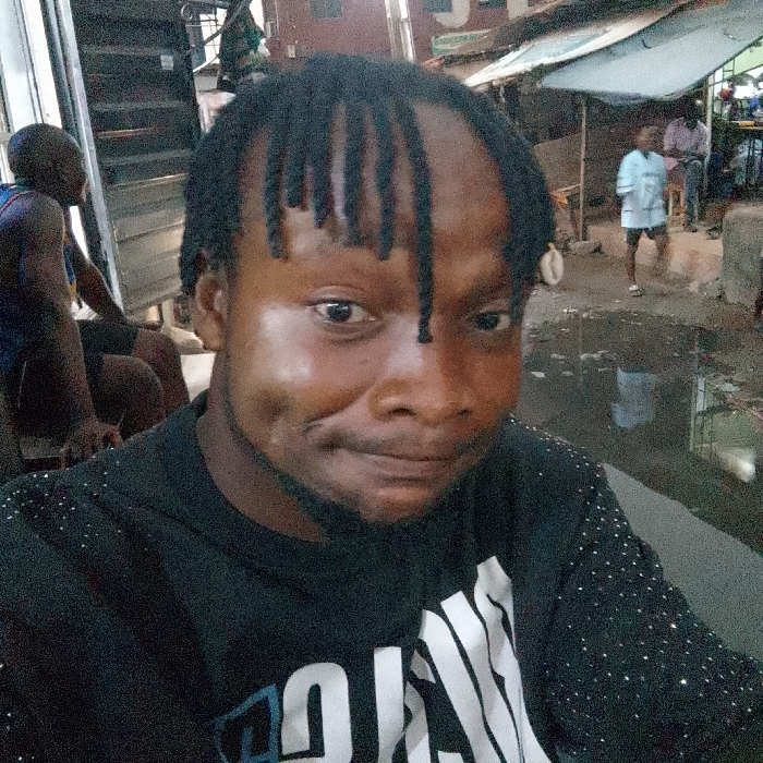 A person with dreadlocks and a black patterned shirt takes a selfie. The background shows a man in a white shirt walking beside a puddle-filled street. There are several structures in the background covered by fabric and possibly other people. Another person sits behind the subject.