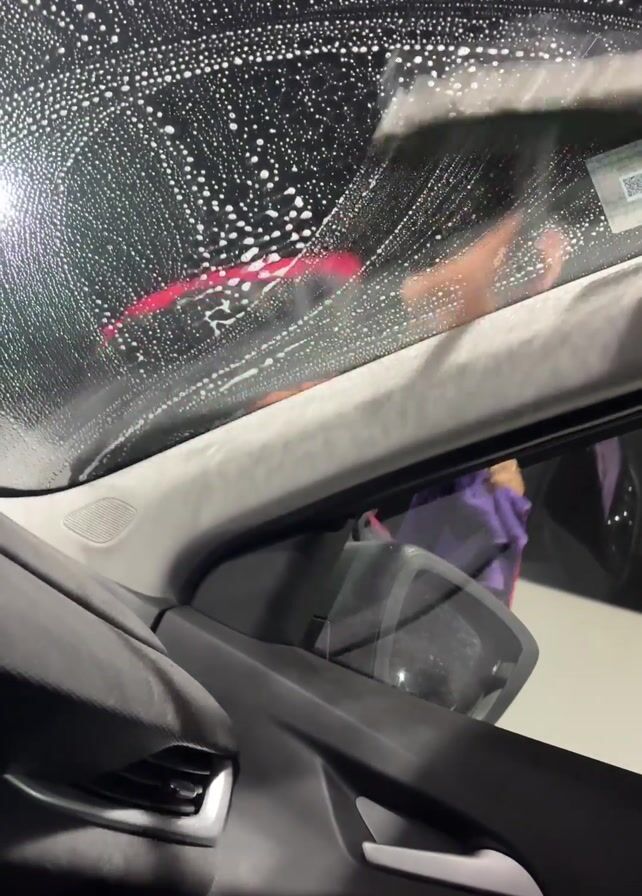 From inside a vehicle looking out through the front windshield, a person cleans the windshield with a long-handled squeegee. The windshield is covered in soap and water. A black dashboard and interior door panel are visible in the foreground. A side mirror is also visible through the window.