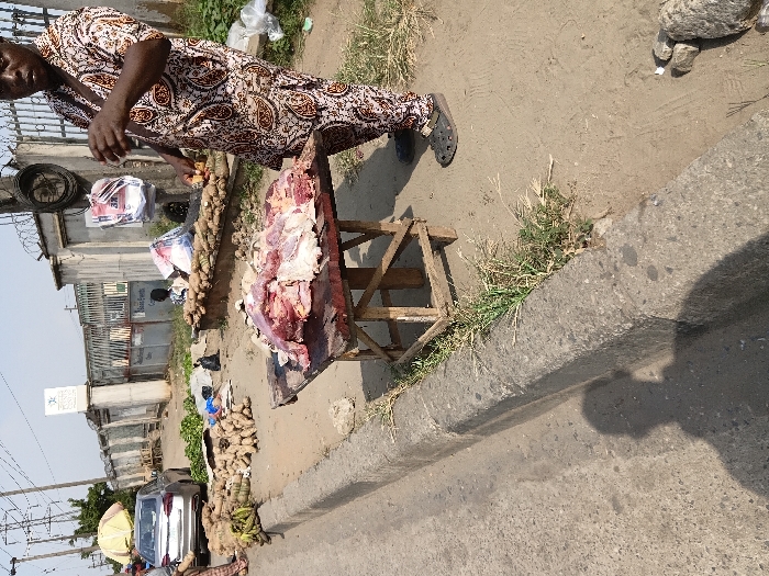 The image depicts an outdoor street market scene in Shangisha, Nigeria, under clear daylight conditions. In the midground, an adult male vendor with dark skin, wearing a patterned brown and white tunic and trousers, stands beside a rustic wooden table. Piled on this table is a substantial quantity of raw red and white meat cuts, showing evidence of blood on the wood surface. The vendor holds a small, light-colored object in his right hand, extended forward. He wears black, closed-toe sandals. To the vendor's left, multiple piles of various root vegetables, resembling yams or cassava, are displayed directly on the dirt ground and on a low, makeshift wooden platform. Some green leafy vegetables are also visible near these piles. A silver sedan is parked further left under a yellow market umbrella, with a partially visible individual near it. Another individual, possibly a child, is seated behind the yam display in the mid-background. The scene features a concrete curb in the immediate foreground, separating an asphalt road from the dirt market area. Sparse green grass grows along the base of the curb. A photographer's shadow is cast on the asphalt road in the lower-left. In the background, a high concrete wall topped with barbed wire encloses a property, featuring a metal gate and a white sign partially displaying "Green Earth." Utility poles and overhead wires are visible against a bright, clear sky.