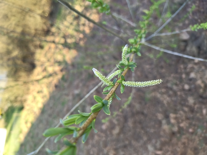 A close-up image depicts a branch of a plant displaying spring growth in Mettlach, Germany. A light brown and green woody stem extends diagonally from the upper left to the lower right of the frame. Small, bright green, oval leaves are attached along the stem. Several elongated, cylindrical catkins, light green to whitish and spiky in texture, are present. One prominent catkin hangs from the main stem towards the lower left. The background is significantly out of focus, showing blurred brown and green tones indicative of ground or distant vegetation under natural light.