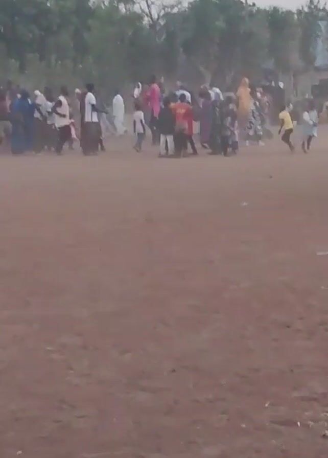 group of people gathered in a dirt field. The group consists of men, women, and children. They are dressed in various colors. Some appear to be dancing. There are trees visible in the background and the sky is overcast. The video appears to be taken from a distance and is somewhat shaky.