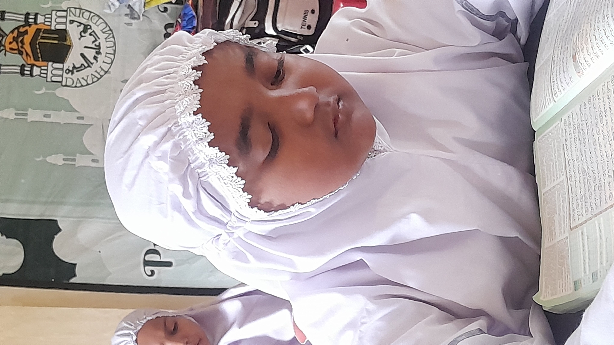 A girl is sleeping on an open Quran in Lhokseumawe, Indonesia. She wears a white prayer hijab with lace trim. Behind her is a green prayer rug printed with an image of the Kaaba. A tennis racket bag is visible in the background. Another girl wearing a similar hijab can be seen partially in the lower left corner of the frame.