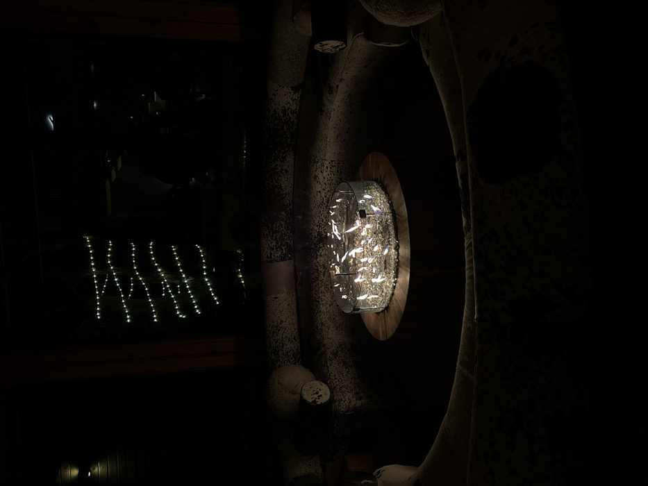 A dimly lit interior features a unique wall fixture. The fixture consists of a circular wooden frame enclosing a glass or metallic structure filled with numerous small lights. Textured, possibly sculpted, pillars or supports frame the fixture. To the left, a dark, reflective surface displays a faint string of lights, seemingly a reflection of an exterior light source. The overall scene evokes a sense of architectural curiosity and subdued illumination.