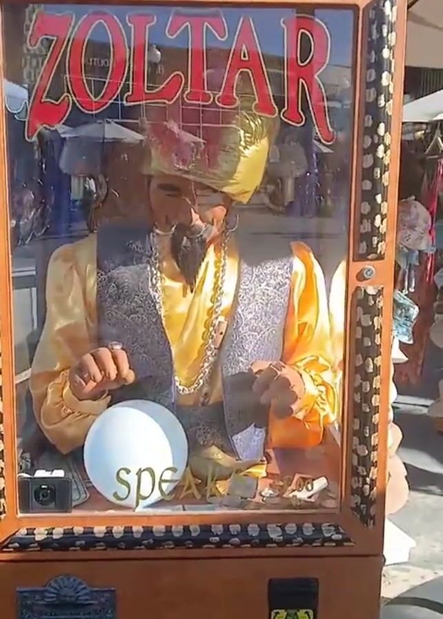 Zoltar machine in an outdoor setting, possibly a market