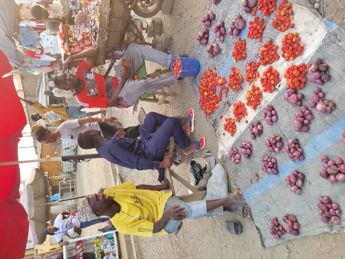 Four men are gathered near a vendor's wares at an outdoor market. Onions and what appear to be small tomatoes or peppers are displayed on a tarp on the ground. The men are casually dressed, some seated, while others stand nearby. One man wears a red shirt, another a yellow shirt, and another a blue outfit. A market cart with goods is visible in the background. Overall, it is a candid scene of social interaction amid the commerce of a marketplace.