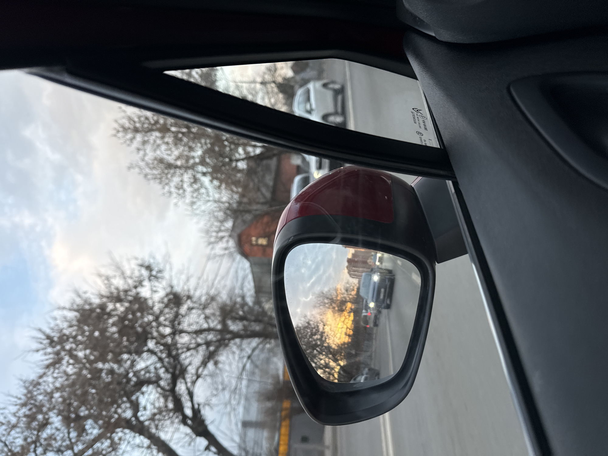 An image captured from inside a vehicle displays a street scene in Akulovo (Gp Kubinka), Russia, at dusk or dawn. The primary view through the car's window shows bare deciduous trees with an overcast sky overhead, featuring light clouds. On the left, a dark-colored building with a yellow horizontal stripe is partially visible behind the trees. To the center-right, a two-story reddish-brown residential building with a sloped roof is present. A white SUV or similar vehicle is visible on the right side of the road, moving or parked. A prominent black-framed side mirror, attached to a red car body panel, reflects the road behind the viewer. In the mirror's reflection, the sun is low on the horizon, casting a warm golden-orange glow through the bare trees. Multiple vehicles are visible on the road in the reflection, heading towards the observer, with headlights illuminated. A dark-colored SUV is most clearly reflected in the center of the mirror. Further in the distance, a multi-story building can be seen. The car's dark grey/black interior door panel, including a recessed handle and window trim, is visible in the lower right foreground. No individuals are distinctly identifiable in the image.