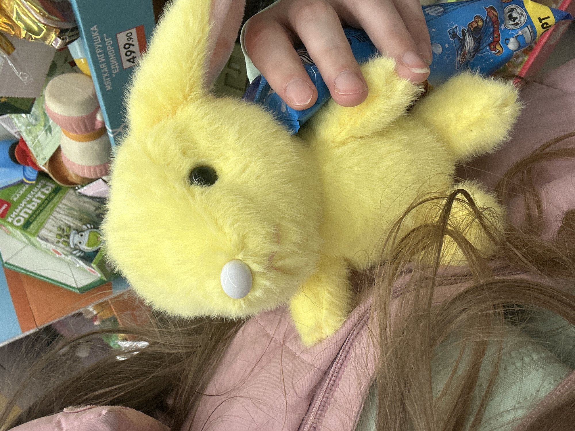 The image presents a close-up view of a yellow plush bunny toy being held by a person, with a partially visible blue and yellow treat or candy wrapper between the fingers of the hand. The bunny has a black button eye and a white button nose. The toy is lying on top of a pink quilted jacket or garment, with long brown hair visible beneath it. The background shows various objects, including a toy resembling a stack of macaroons, a blue box with the text "МЯГКАЯ ИГРУШКА 'ЕДИНОРОГ'" and the price "499.90" visible on it, and a green box with text in a Cyrillic script. The location is inferred to be Moscow, Russia, based on the Cyrillic text on the packaging.