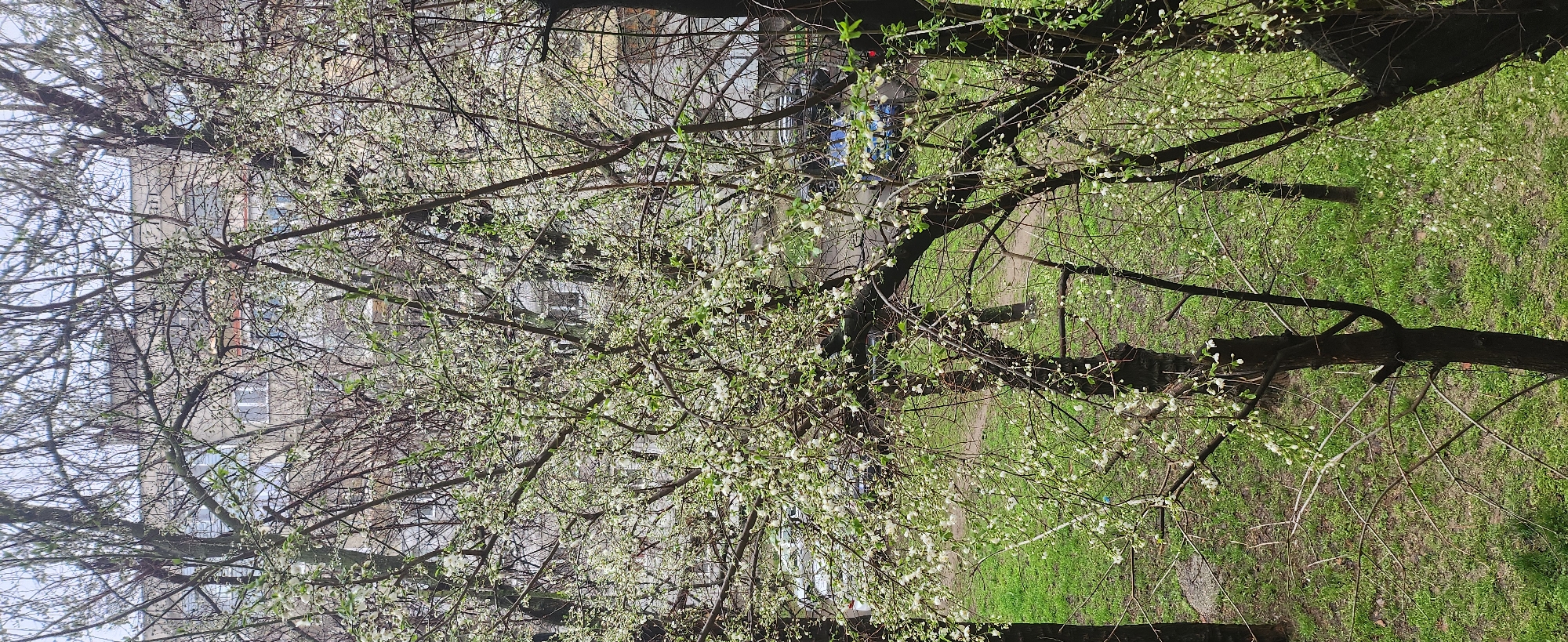 The image depicts a view through blossoming trees in Ruse, Bulgaria. In the background, buildings are visible, suggesting an urban setting. The foreground is dominated by the branches of the trees, laden with white blossoms and emerging green leaves, indicating springtime. Patches of green grass are seen, interspersed with areas of bare earth. A path is also discernible. The angle of the photograph suggests it was taken from an elevated position, potentially a window or balcony.