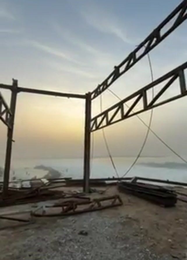 construction site near the ocean. A metal frame structure stands incomplete on a gravelly surface. Scattered around the base of the structure are pieces of metal construction materials. The ocean is visible through the frame, and the sky is a pale blue with hints of yellow from the setting sun. The waves are visible in the distance.