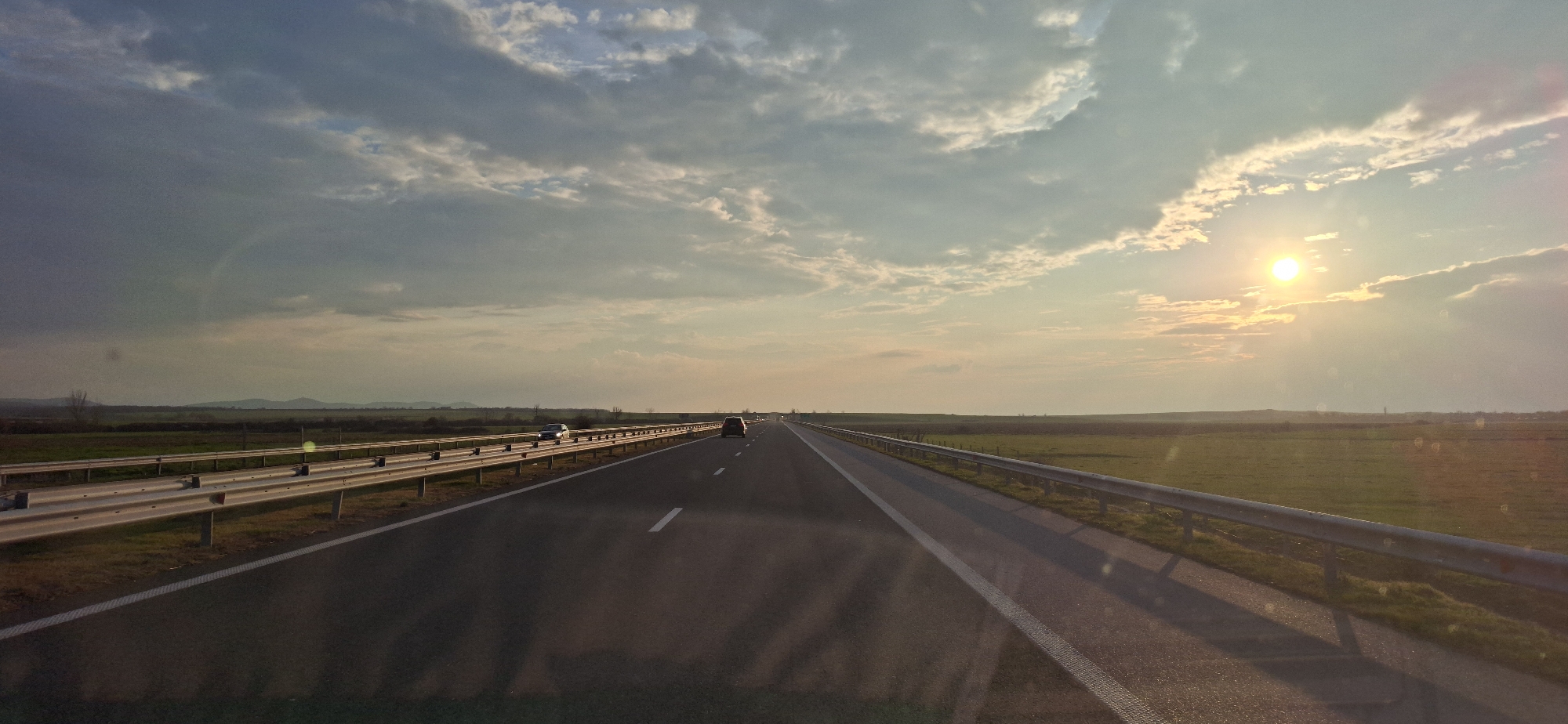 highway in the city of Zheleznik, Bulgaria, at sunset. The road is straight and has two lanes in each direction, divided by a median strip. Guardrails line both sides of the road. Two cars can be seen in the distance, traveling on the highway. The sky is filled with clouds, and the sun is setting on the right side of the image. There is a faint rainbow in the sky on the left. Beyond the road, there is a flat, grassy plain on either side. In the distance, some hills can be seen.