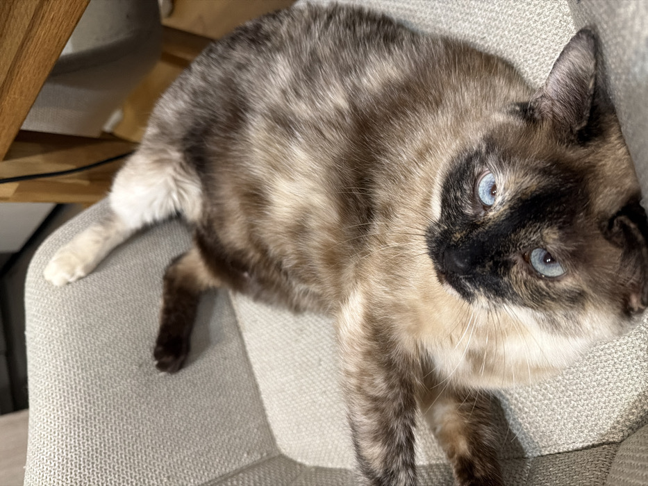 - "An indoor photograph captures a single domestic feline subject, a cat, positioned supine on a light-colored, textured upholstered chair or sofa" by FM-NUMeh1, licensed under CC BY 4.0