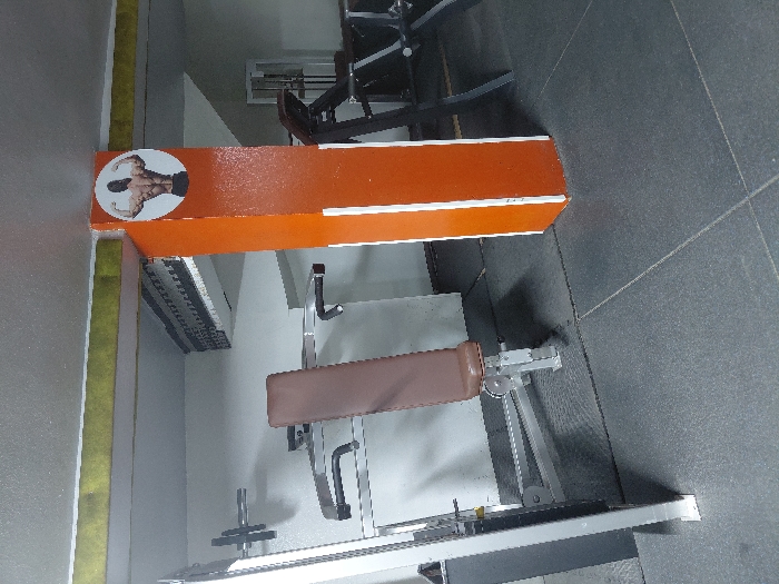 An indoor scene shows gym equipment: a leg extension machine with a brown seat and weight plates. Above it, a section of an orange machine has a white circle with a muscular figure printed on it. The equipment is on a dark gray floor, adjacent to a light gray wall with a yellow padded strip running vertically. Other gym equipment is partially visible in the background. The image appears to be rotated slightly counter-clockwise.