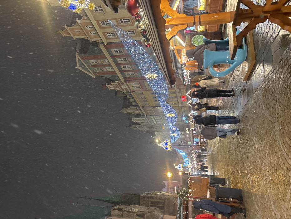 Snow falls over a European city at night. Buildings line a cobblestone street adorned with festive blue and white lights strung overhead. People walk along the street. A carnival ride-like structure appears on the right, with a blue, tuba-shaped seat visible. Market stalls are present on either side of the walkway, suggesting a Christmas market or similar holiday event.
