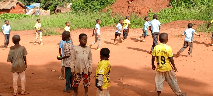 A group of children are playing in a dusty, rural area. Most are boys, wearing a variety of casual clothes, some in yellow or blue shirts. A few children stand closer to the viewer, while others move in the background. A boy holds a green object, possibly a ball or fruit. A hut is visible in the background, indicating a village setting, with a reddish dirt ground and some vegetation.