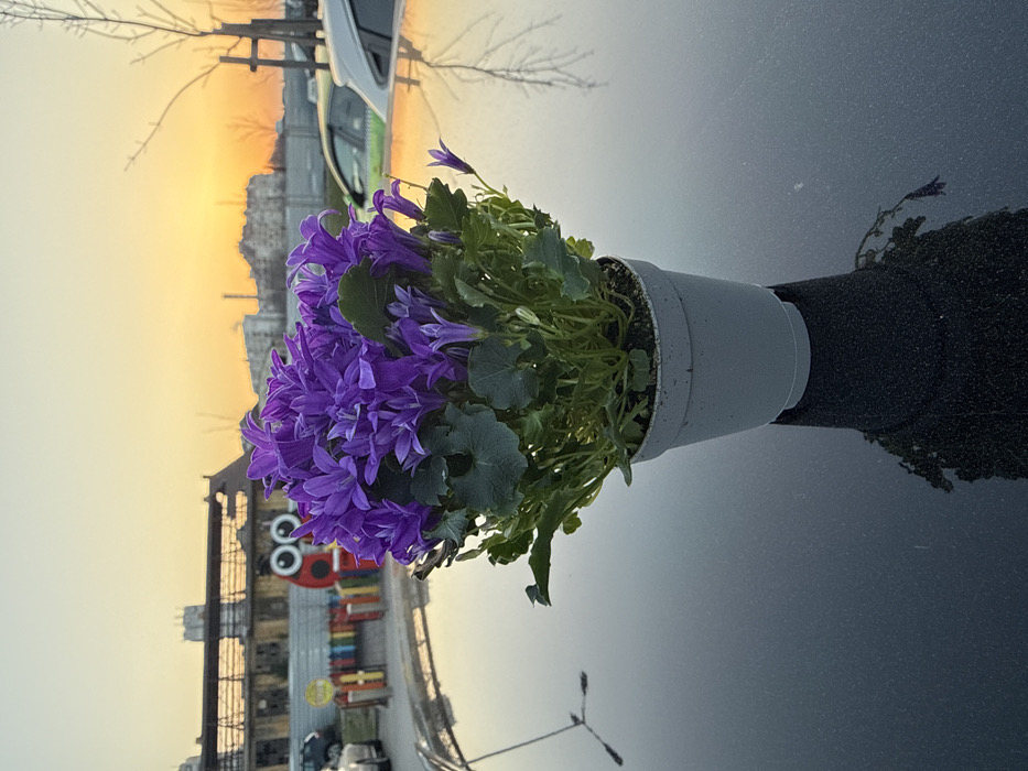 - "A potted purple campanula plant with numerous bell-shaped flowers and dark green leaves rests on a highly reflective, dark metallic surface, likely the hood of a vehicle" by FM-QK5pm1, licensed under CC BY 4.0