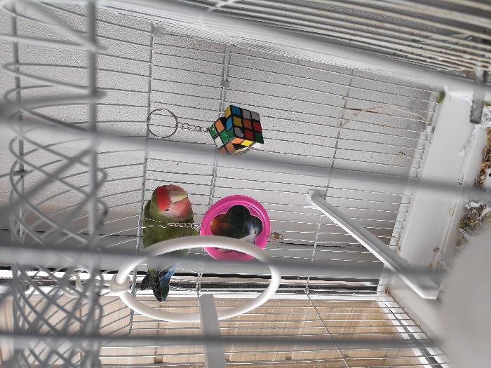 - "An indoor scene in Hlybokaye, Belarus, depicts a single lovebird positioned within a white wire birdcage" by FM-4y4T32, licensed under CC BY 4.0