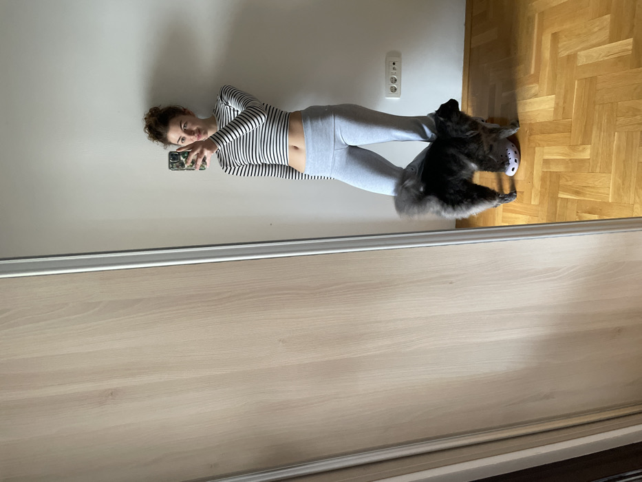 An indoor scene in Boreti, Montenegro, captured as a mirror selfie. A light-skinned female, with brown hair styled in a bun, stands facing a mirror, holding a smartphone with a patterned case in her right hand. She wears a long-sleeved black and white striped crop top, exposing her midriff, and light grey yoga pants. A fluffy, dark grey domestic cat stands between her legs, facing right, its bushy tail raised. A single light purple Croc-style shoe is positioned on the wooden parquet floor beneath the cat. The background consists of a plain white wall with a double electrical outlet visible on the right, and part of a light wood wardrobe with a full-length mirror panel on the left. The floor is made of light wooden parquet in a herringbone pattern.