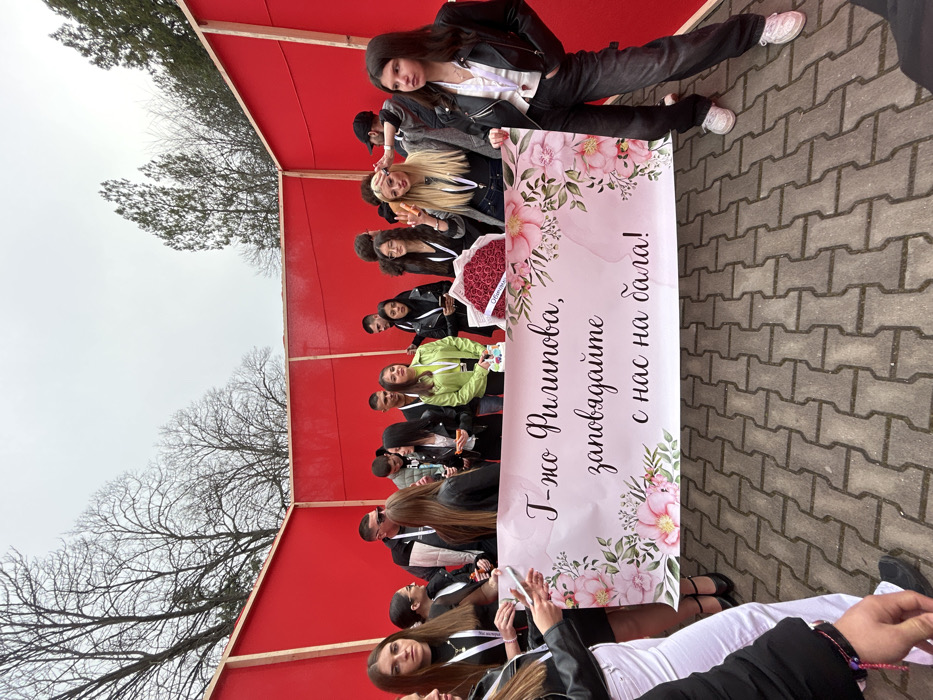 The image captures an outdoor gathering of approximately 20-25 young adults in Stara Zagora, Bulgaria, set against a backdrop of temporary red paneled walls. The ground beneath the individuals is paved with grey interlocking concrete blocks. In the foreground, a prominent horizontal banner is held by eight individuals. The banner is light-colored, adorned with a decorative floral border featuring pink blossoms and green leaves. The Bulgarian text on the banner translates to: "Ms. Filipova, welcome with us to the ball!" Among the group, several individuals wear casual modern attire, including leather jackets and white lanyards with identification badges. One person, positioned behind the banner to the right, holds a large bouquet of red roses wrapped in white paper. Another individual behind the banner holds a small, multi-colored boxed item. The background reveals deciduous trees with bare branches and some evergreens under a dull, overcast sky.
