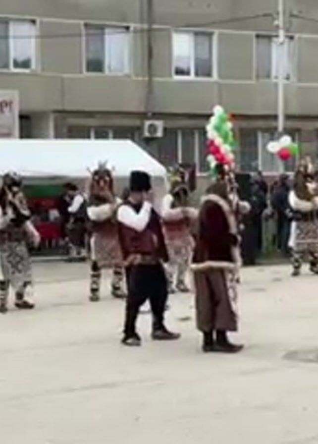 group of people, some wearing traditional Bulgarian Kukeri masks and costumes, performing a ritual in an outdoor public space