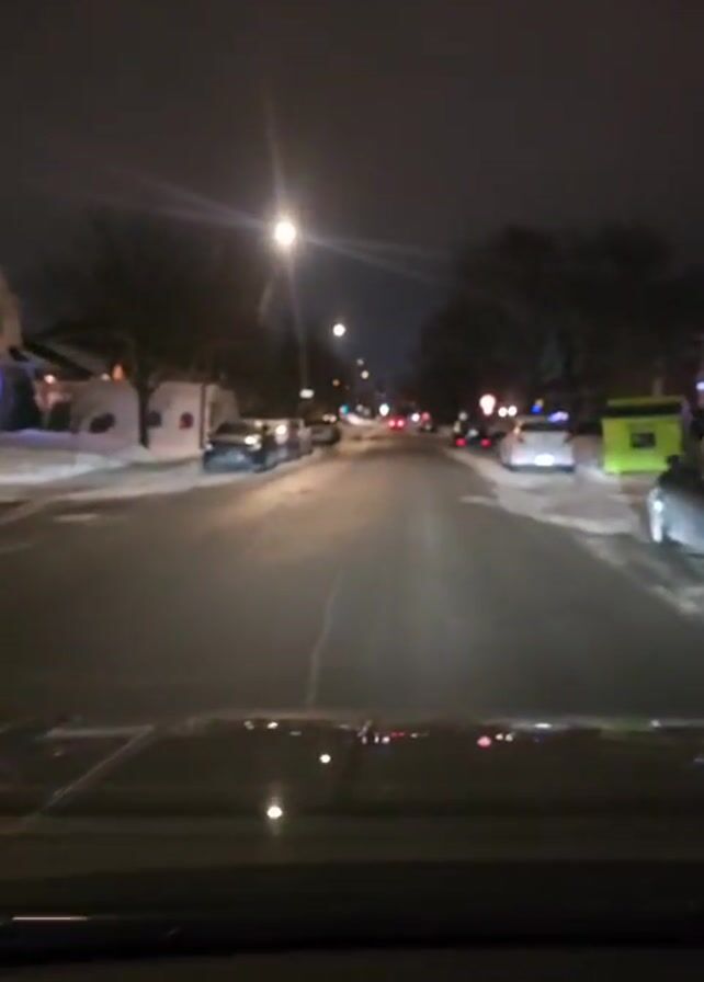 view from inside a car driving down a residential street at night. The street is illuminated by overhead streetlights. There is snow on the ground and sidewalks. Cars are parked along both sides of the street. The road appears wet. The car is moving forward and the camera is pointed towards the road ahead. The dashboard is visible at the bottom of the frame. Music is playing in the background.