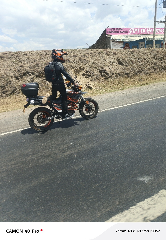 The image depicts a single individual on a motorcycle positioned on the paved shoulder of a road in Gilgil ward, Kenya