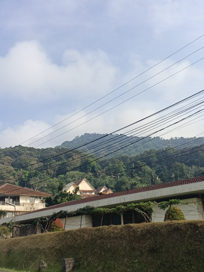 The image displays an outdoor scene located in Basedth, Cambodia, under a partially cloudy sky. The upper portion of the frame features a light blue sky with scattered white clouds. Numerous black electrical or communication cables span diagonally across the middle and upper-middle sections, from upper-left to lower-right. In the background, a dense, green forested mountain range rises prominently. Within this foliage, several structures with reddish-brown tiled roofs are partially visible. In the lower midground, a multi-story building with light-colored walls and a similar reddish-brown tiled roof is situated on the left, featuring an observable balcony on its upper level. To its right, and slightly further back, additional buildings with similar architectural styles are interspersed among the trees. A long, linear building with a distinctive reddish-brown tiled roof edge and light-colored walls extends horizontally across the lower midground. This building's upper facade is adorned with a trellis system supporting green foliage, and a reddish-orange bush is visible along its base. The foreground consists of a sloped bank or wall covered in dense, textured, short green-brown vegetation. A dark, irregularly shaped object, possibly rock or concrete, is partially visible at the bottom left edge of this bank. No individuals are present, and no active interactions or specific actions are depicted. The environment suggests a developed area at the foot of a forested mountainous region.