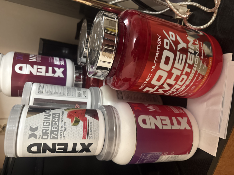 The scene is set indoors in Pazardzhik, Bulgaria, featuring a cluster of dietary supplement containers arranged on a dark, flat surface, likely a shelf or table. No individuals are present, and no actions are depicted. In the immediate foreground to the right, a large, cylindrical, glossy red container of "SCITEC NUTRITION 100% WHEY PROTEIN PROFESSIONAL" stands upright. It features a prominent silver metallic lid and bears text indicating "SALTED CARAMEL FLAVORED" and "30 SERVINGS." To the left of the Scitec container, a stack of two white cylindrical supplement containers is positioned. The topmost container is labeled "XTEND THE ORIGINAL 7g BCAA," displaying a graphic of watermelon slices and specifying "FLAVOURED WATERMELON EXPLOSION," "30 SERVINGS," and "NET WT 423 g." This container is resting directly on a second white cylindrical container with a purple label, partially visible, which also displays the "XTEND" logo and "WHEY PROTEIN" text, with "30 SERVINGS" legible. Behind the stacked XTEND containers and to their right, another white cylindrical "XTEND WHEY PROTEIN" container with a purple label is partially visible. Further back, several additional, less distinct red and white cylindrical containers with reflective silver lids are clustered. A folded piece of white paper or tissue is situated on the dark surface beneath the lower XTEND container and adjacent to the Scitec container. On the far right, a metallic, coiled or mesh-like decorative object is partially visible. The background consists of a dark, indistinct surface, possibly a wall or the interior of a cabinet, with a dark, rectangular object, possibly an electronic device, visible in the upper right. The scene is illuminated by an unseen light source, creating reflections on the container surfaces and metallic lids.