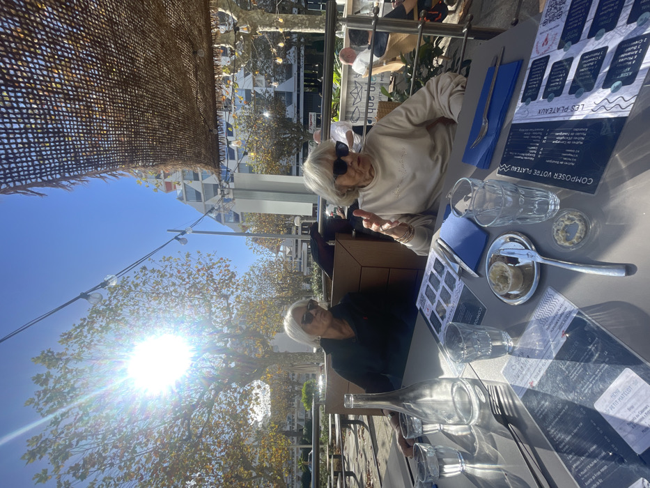 The scene depicts an outdoor dining area in La Grande-Motte, France, under a clear, bright sky. Two elderly women are seated at a rectangular grey table in the foreground. The woman on the left has short white hair and wears dark sunglasses and a dark long-sleeved shirt. The woman on the right has short white hair, wears dark sunglasses, and a light-colored long-sleeved top; she is actively gesturing with both hands, suggesting conversation. On the table are multiple clear drinking glasses, an empty glass carafe, several blue and white menus written in French, blue folded napkins, silverware (forks and knives), and small dishes containing food items—one with a light-colored spread and a small fork, another with a ring-shaped item. Intense sunlight creates a bright glare on the left side of the table. The environment includes trees with sparse, yellowish leaves, suggesting late autumn or early spring. Overhead, a light-brown mesh shading material is partially visible, strung with decorative lights. In the background, distinctive white, pyramidal architectural structures, characteristic of La Grande-Motte, are prominent. Other patrons and a person in a white shirt (possibly staff) are vaguely visible in the background, seated at additional outdoor tables.
